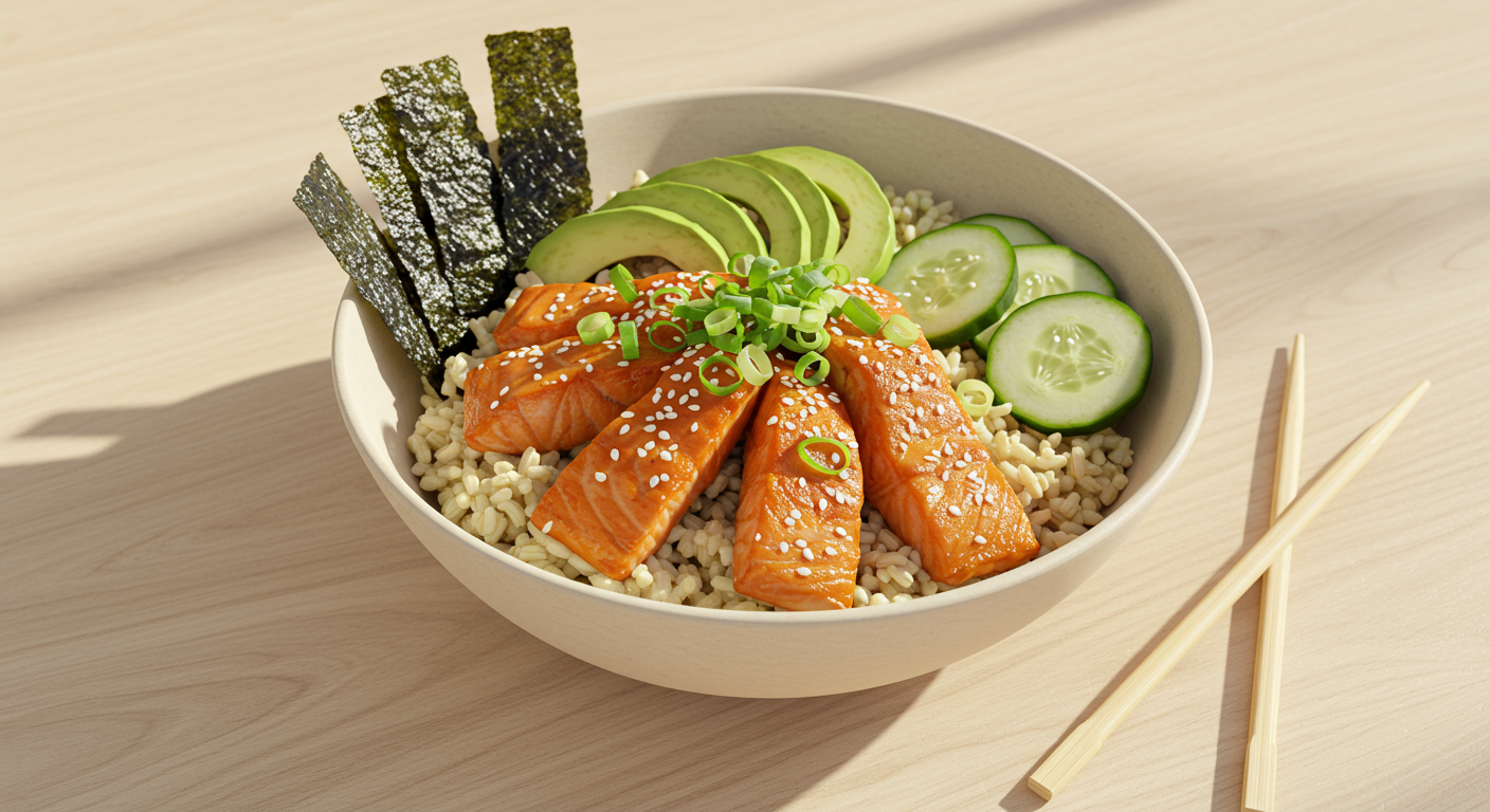 | | Seared garlic-ginger salmon rests on a fluffy scoop of steamed brown rice along with silky avocado, crisp cucumber slices and salty nori in this healthy salmon bowl recipe. |