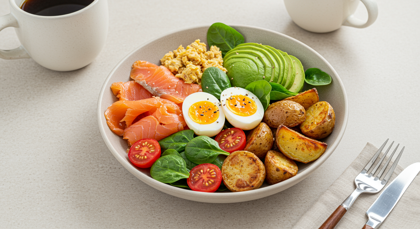 This healthy breakfast bowl recipe is loaded with crispy breakfast potatoes, eggs, veggies, avocado, and smoked salmon. Full of flavor and a well-balanced meal, it's the perfect way to start the day! Customizable to your liking, gluten-free, and meal prep friendly. |